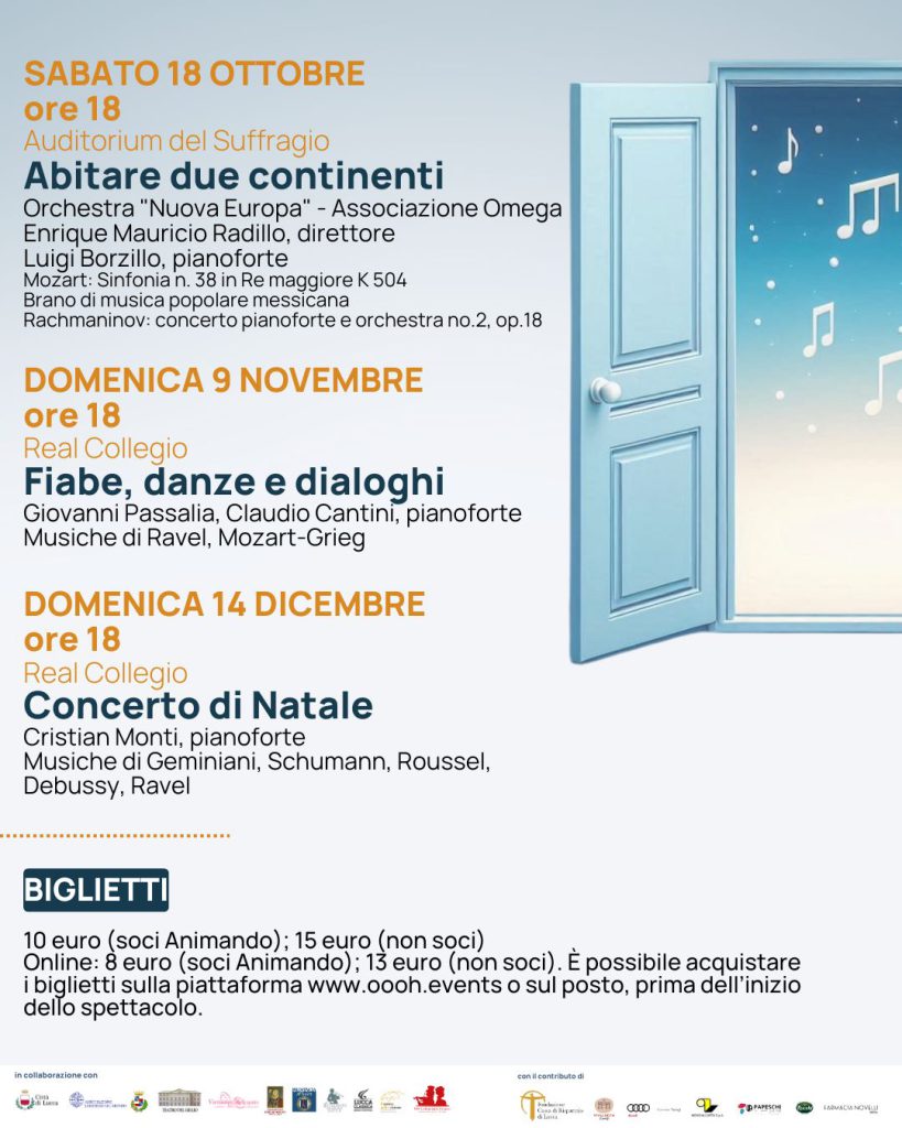 Il primo appuntamento è sabato 18 ottobre, alle 18, all’Auditorium del Suffragio: “Abitare due continenti” presenterà sul palco l’orchestra Europa dell’associazione Omega, in un dialogo con il Sudamerica. Un viaggio tra Rachmaninoff, di cui sarà eseguito l’emozionante Concerto n°2, Mozart e la musica tradizionale messicana diretto da Enrique Mauricio Radillo con Luigi Borzillo al pianoforte.